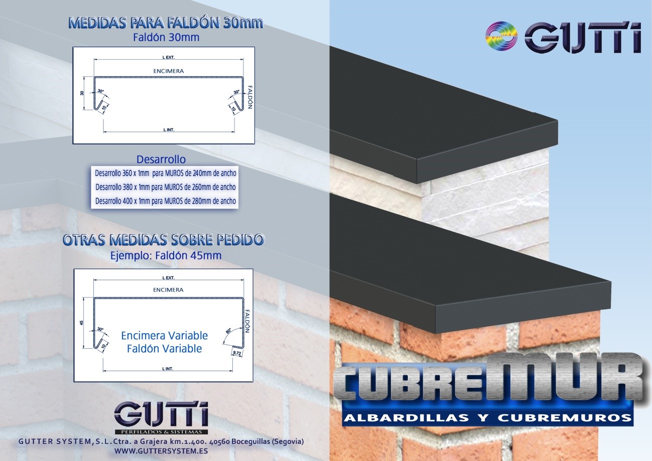 En esta ocasión GUTTI empresa líder en el sector de perfilados y sistemas de aluminio lacado, ofrece a sus clientes todo tipo de CUBREMUROS Y ALBARDILLAS en aluminio lacado y acero lacado, en cualquier diseño y medida que se requiera.